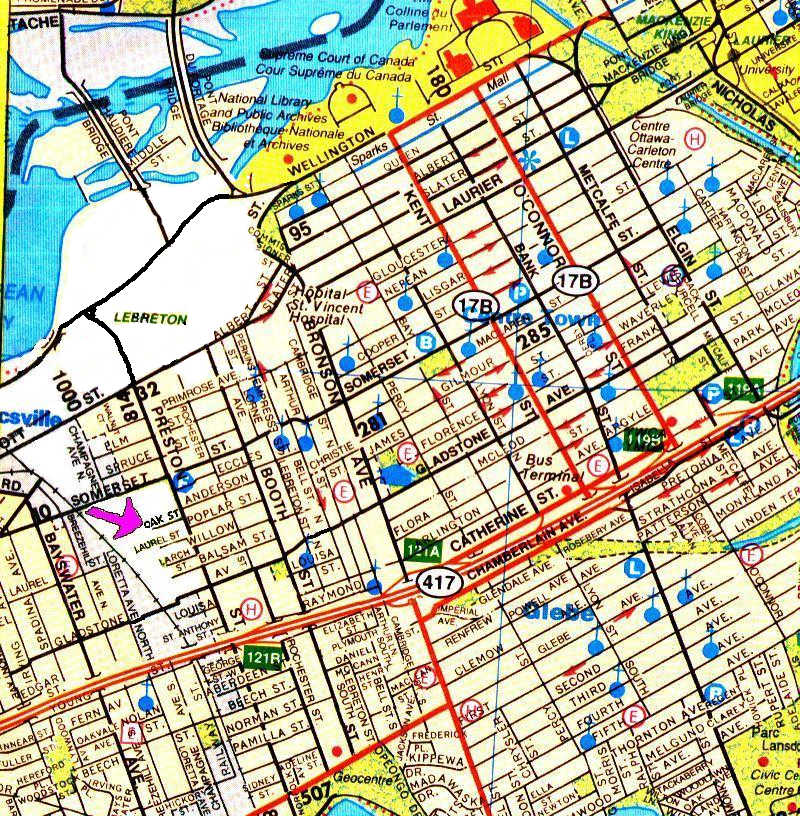 Oak Street is a cul-de-sac just one block long, on the west side of Preston St. It runs west from Preston Street, one long block south of Somerset Street West. Houses are only on the south side of the street; Plouffe Park is on the north side. Oak Street is: